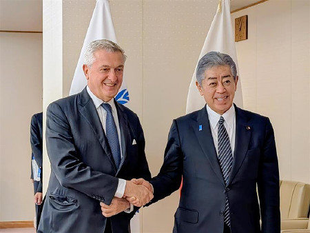 握手する岩屋毅外相(右)とグランディ国連難民高等弁務官。パレスチナ自治区ガザなどの人道状況改善に向けて協力していくことを確認した=15日午後、外務省 【時事通信社】