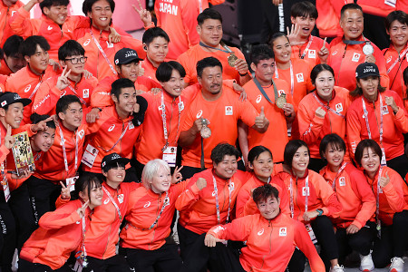 聴覚障害者のための国際総合大会、第25回夏季デフリンピック東京大会は26日、東京体育館で閉会式が行われて閉幕し、12日間の日程を終えた。写真は閉会式に臨む日本選手団。 【時事通信社】