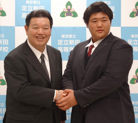 大相撲の春日野部屋への入門が決まった東京・足立新田高の甲斐田龍馬(18)=右=が16日、東京都足立区の同校で記者会見し、「3年くらいで関取に上がりたい。横綱になりたい」と緊張した面持ちで大志を語った。 【時事通信社】