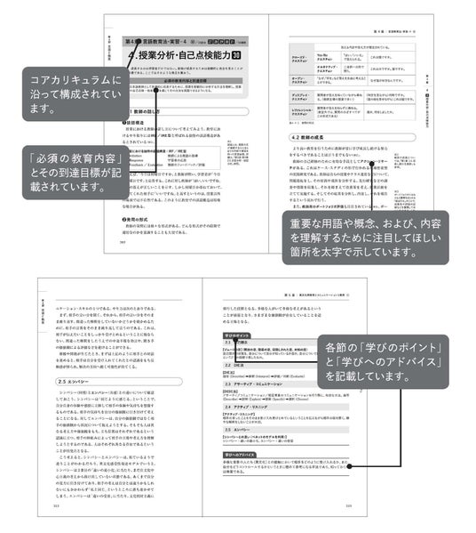688ページの大ボリュームで、教員養成課程コアカリキュラムの全項目を網羅的に解説しているので、入門者から現役教師まで日本語教育に必要な知識をこの1冊で体系的に学習できます。コアカリキュラムに沿って、「学習の到達目標」や「学びのポイント」がよくわかる構成となっています。